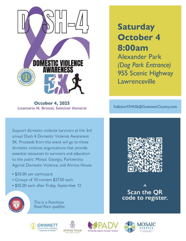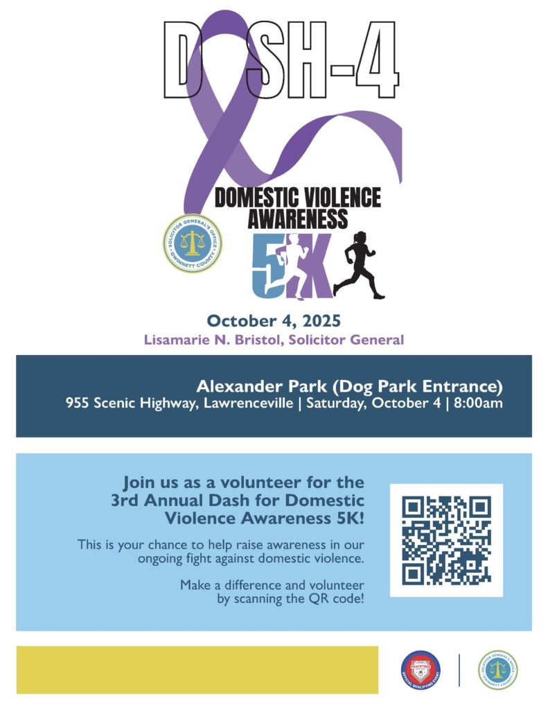 Join us for the Dash 4 Domestic Violence Awareness 5K on October 4, 2025, at 8:00 AM, located at Alexander Park, 955 Scenic Highway. Lawrenceville, GA.