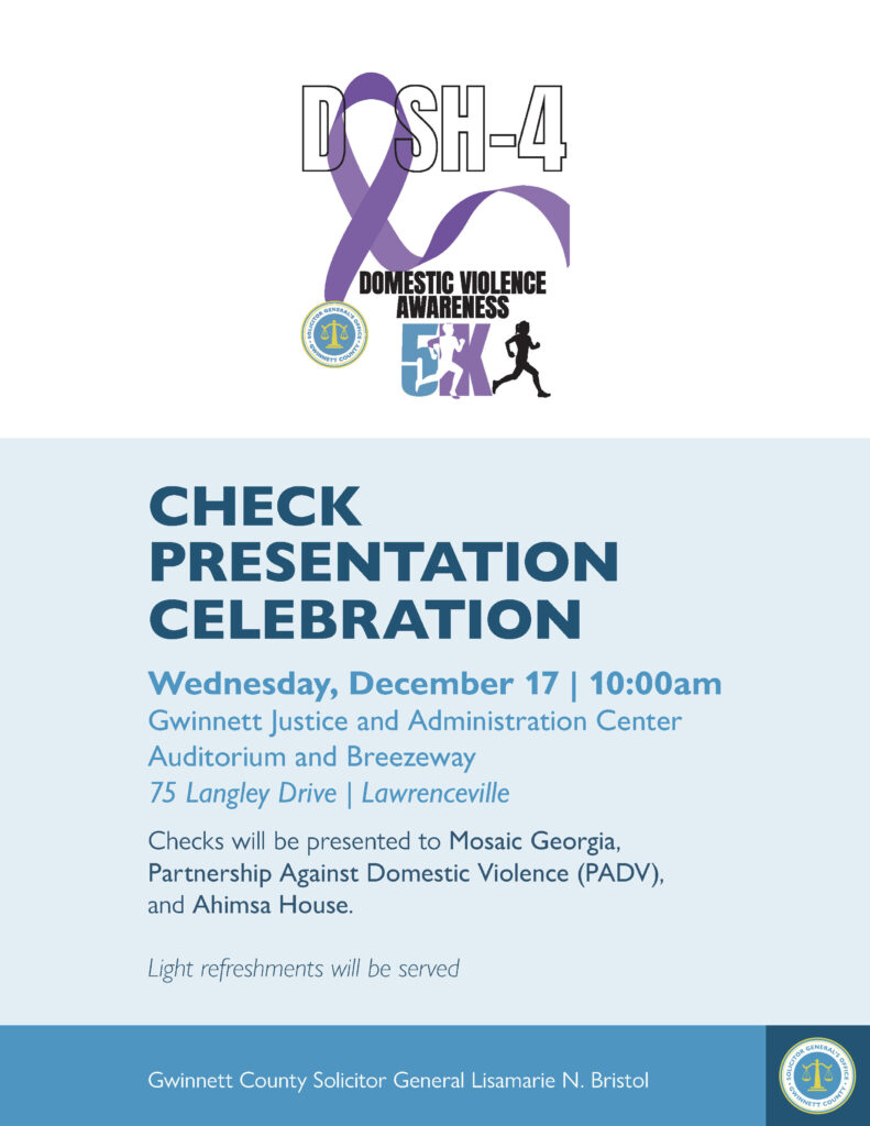(Lawrenceville, Ga., Dec. 16, 2025) – The Gwinnett County Solicitor’s Office will award proceeds from its Dash 4 Domestic Violence 5K to three local nonprofits during a check presentation on Dec. 17 at 10 a.m. in the Gwinnett Justice and Administration Center auditorium.